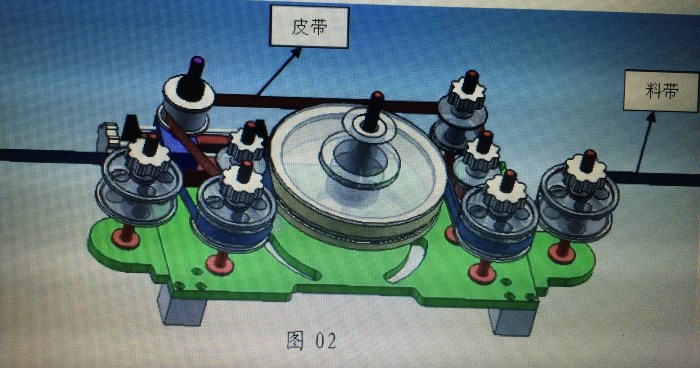 ⑴. 牽引裝置帶動料帶,將料帶拉進(jìn)去,依次經(jīng)過導(dǎo)位輪,點鍍模具,然后出去。